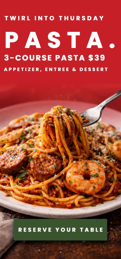 Grilled Beef parrpadelle fungo and/or Mediterranean Seafood Prima Vera, Country-Style Bolognese, Saffron & Butter Risotto with Grana Padano Cheese & Sweet Peas, Classic Lasagna, and more.